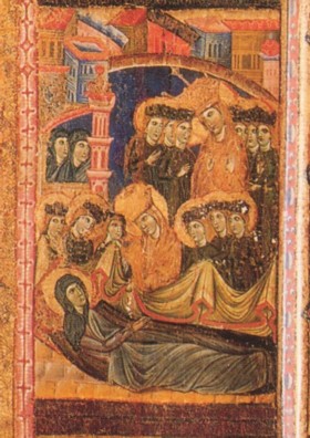 Bild links: Lt. einer Vision von Sr. Benvenuta empfängt Klara Besuch von Maria und himmlischer Frauen